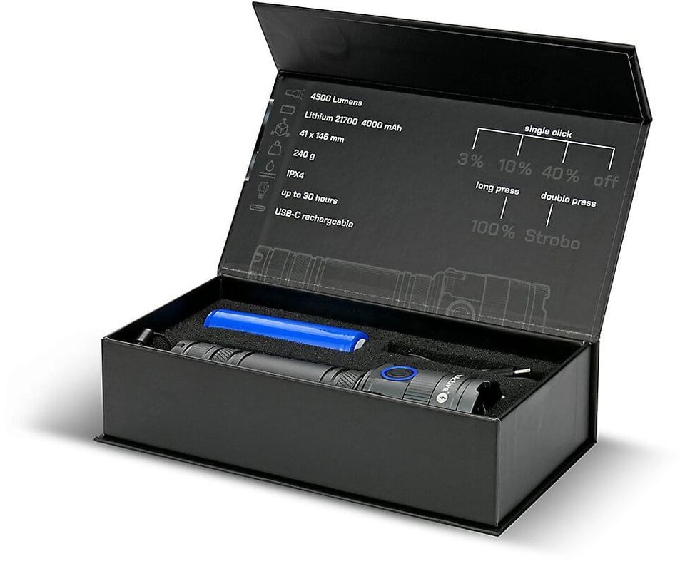 Zawartość zestawu: latarka, akumulator (21700), kabel USB-C, smycz / zawieszka, instrukcja obsługi