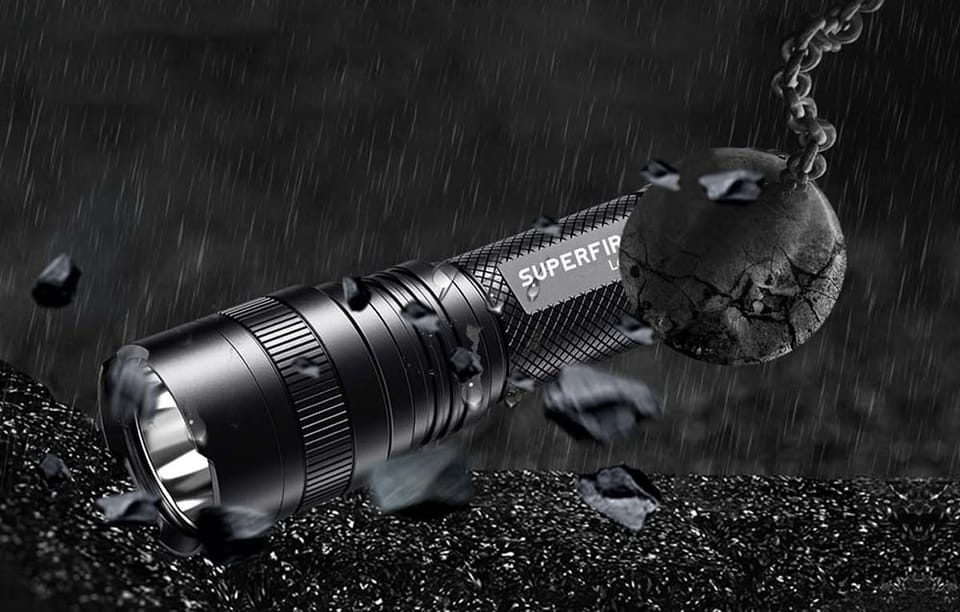 Latarka Superfire L6-U została wykonana z trwałego stopu aluminium, dzięki czemu doskonale sprawdzi się podczas górskiej wędrówki czy pod namiotem. Produkt jest wodoodporny na poziomie IP44, ponadto niestraszny mu wiatr, kurz, a nawet upadek z wysokości 1 metra. To doskonały towarzysz ekstremalnych wypraw.