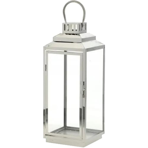Latarni metalowa. Srebrna stal chromowana. Szklane boki. Rączka do przenoszenia.
