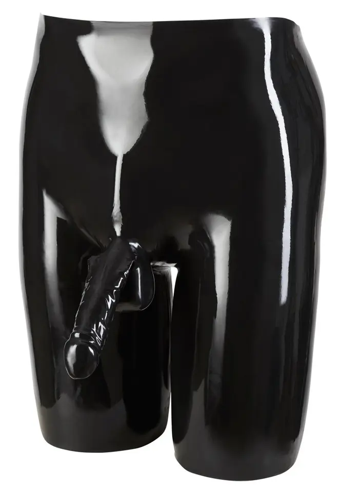 Pochwal się swoją męskością! Czarne lateksowe spodenki rowerowe z anatomicznie ukształtowanym etui na penisa i jądra z wyraźnymi żyłami.