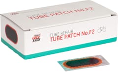 Łatka nr F2 o rozmiarze 50 x 25 mm służy do naprawy uszkodzeń dętek rowerowych, w rozmiarze