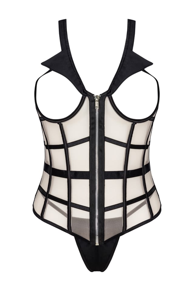 Dwuczęściowy zestaw składający się ze zmysłowego gorsetu z odsłoniętymi piersiami i czarnych, seksownych stringów. Gorset jest rozpinany z przodu na suwak co ułatwia zakładanie. Kolorystyka zestawu to czarny i beż, które tworzą razem pociągające połączenie. Warto też zwrócić uwagę na kuszące szczegóły jak czarny kołnierzyk czy czarne pasy ułożone w taki sposób by jak najlepiej podkreślały talię. Tym co najbardziej wyróżnia ten gorset są wycięcia eksponujące biust. Sprawia to, że cały zestaw jest bardzo odważny i prowokujący. Nie wiele pozostaje dla wyobraźni. Jako dopełnienie kompletu świetnie sprawią się naklejki na sutki, które dodadzą pikanterii.