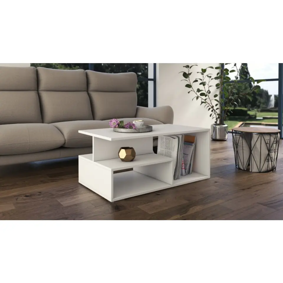 Ława kawowa wykonana z solidnej płyty laminowanej wraz z dodatkową półką na przedmioty codziennego użytku. Świetnie nadaje się do nowoczesnych salonów, mniejszych pokoi, czy eleganckich biur.