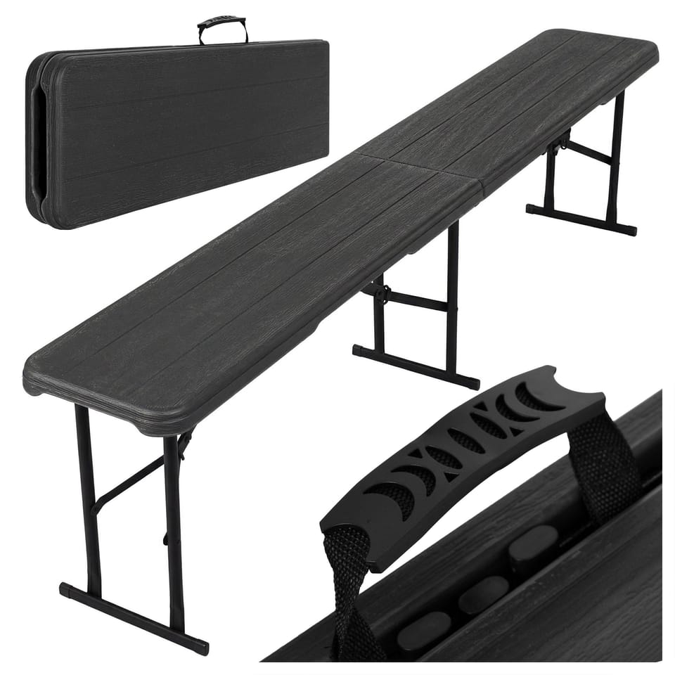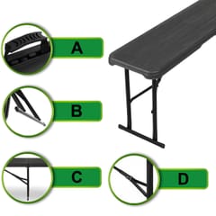 Ławka cateringowa WOODLAND składana czarny matDługość 180 cm⭐️ Faktura wiernie naśladująca drewno⭐️ 100% wodoodporna⭐️ Składana w walizkę⭐️ Solidny system składania i rozkładania⭐️ Zakup od producentaSolidna i niezawodna ławka cateringowa idealnie sprawdzi się na wszelkich imprezach plenerowych i wypoczynku na świeżym powietrzu. W pełni składana, dzięki czemu zajmuje niewiele miejsca. Odporna na warunki atmosferyczne. Stabilna i trwała konstrukcja gwarantuje maksymalną funkcjonalność i użytkowanie przez długi czas.Materiał siedziska to wytrzymały polietylen HDPE. Rama, profile oraz nogi zostały wykonane ze stali i pomalowane na czarny matowy kolor. Dodatkowo, nogi ławki posiadają wzmocnienia w postaci wsporników, które po rozłożeniu zabezpieczane są specjalną blokadą. Ławka jest lekka, a po złożeniu w formę walizki zajmuje mało miejsca. Specyfikacja:stabilna konstrukcjałatwa i szybka w rozkładaniu i składaniumateriał siedziska: polietylen HDPEmateriał stelaża: stal malowana proszkowokolor stelaża: czarny matowygrubość nóżek: 19 mmskładana, z wygodną rączką do transportulekka, zajmuje mało miejsca po spakowaniunogi ze wspornikami z blokadąantypoślizgowe stopy zapewniają stabilnośćśrodkowa noga wzmacniająca konstrukcję Cechy produktu:do użytku wewnętrznego i zewnętrznegomateriał HDPE gwarantuje wysoką odporność na warunki atmosferyczne i promieniowanie UVsprawny i solidny system rozkładania i składania ławki100% wodoodpornaTrwałość przez wiele sezonówIdealna na imprezy plenerowe, do ogrodu, na działkę, camping, piknik.Świetnie sprawuje się w codziennym użytkowaniu. A - Wygodna rączka do transportuB - Podkładki ochronneC - Dodatkowa noga wzmacniającaD - Blokada przed złożeniem stelaża Wymiary:Długość: 183 cmGłębokość: 28 cmWysokość: 43 cmWymiary po spakowaniu:93 x 28 x 8 cm W skład zestawu wchodzi opakowanie zewnętrzne - karton. Oznaczenia na kartonie mogą różnić się ze względu na różne serie dostaw.UWAGA | Przedstawione kolory należy traktować poglądowo - mogą odbiegać od rzeczywistych ze względu na różne ustawienia monitorów oraz proces obróbki zdjęć. Rzeczywiste wymiary mogą się różnić od podanych wyżej. Tolerancja błędów może wynosić +/- 5%.