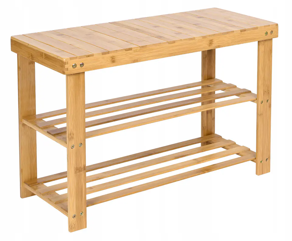 Ławka bambusowa z półkami na buty MILOSPrzeznaczenie: łazienka, korytarz, salon, hall | Kolory: naturalny bambus Uniwersalny mebel wykonany z przyjaznego dla środowiska 100% naturalnego bambusa. Posiada dwie półki na buty i wygodne siedzisko. Całość lakierowana, dzięki czemu jest łatwa w czyszczeniu i odporna na działanie wilgoci. Ławka starannie wykonana, gładka z zaokrąglonymi krawędziami. Praktyczny regał na buty z siedziskiem znajdzie swoje zastosowanie w wielu pomieszczeniach. Mebel sprawdzi się w przedpokoju, korytarzu, sypialni, kuchni czy łazience. Cechy produktuWykonana z przyjaznego dla środowiska 100% bambusa naturalnego, dobrze wykończona, przyjazna dla środowiska i wytrzymała.Regał na buty w oryginalnym kolorze bambusa, doskonale pasuje do każdego stylu wyposażenia.Dwa poziomy z odpowiednim odstępem zapewniają miejsce na maksymalnie 6 par butów, regał na buty może być używany również jako ławka, można też na nim stawiać rośliny, torby lub akcesoria łazienkowe.Lakierowanie sprawia, że jest odporna na wilgoć i łatwa do czyszczenia; zaokrąglone krawędzie i ukryte śruby zapobiegają urazom.Idealnie nadaje się do przedpokoju, korytarza, sypialni, kuchni, łazienki, na balkonObciążenie maksymalne 100 kgWymiary produktu Wysokość 45 cmSzerokość 68,5 cmGłębokość 28 cmOdstęp półek 18 cm Informacje dodatkowePrzedstawione kolory należy traktować poglądowo - mogą odbiegać od rzeczywistych ze względu na różne ustawienia monitorów oraz proces obróbki zdjęć. Rzeczywiste wymiary mogą się różnić od podanych wyżej. Tolerancja błędów może wynosić +/- 5%. Marka:GockowiakKod produktu:321621Kolor:naturalny bambusWysokość: 45 cmSzerokość:68,5 cmGłębokość:28 cmDo samodzielnego montażutak