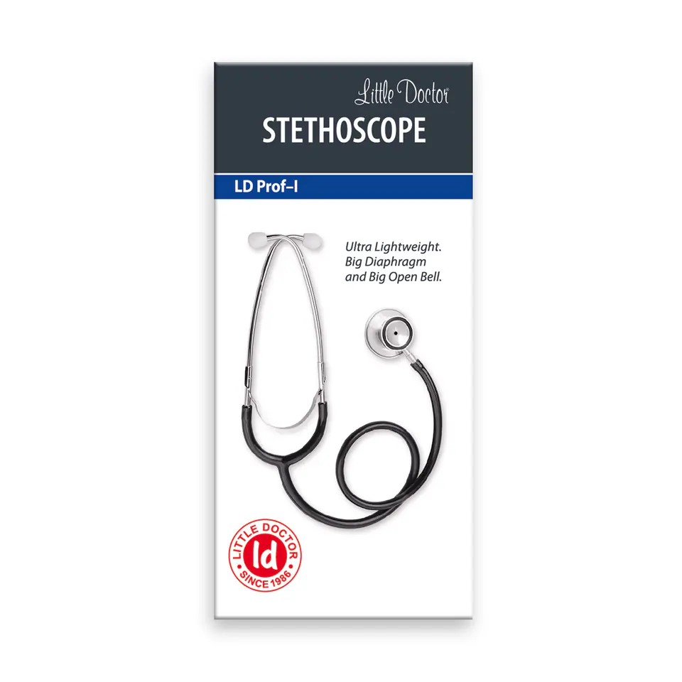 Stetoskop dla lekarzy i średniego personelu medycznego. Model LD Prof-I zapakowano do pudełka kartonowego. Kolor przewodów akustycznych oznaczono na opakowaniu.Funkcje: Dwustronna głowica z lekkiego metalu, z dużą diafragmą i lejkiem. Wygodny obrotowy mechanizm przełączania diafragma-lejek. Gumowa osłona lejka. Wytrzymały przewód akustyczny w kształcie litery Y. Metalowy przewód słuchawkowy ze sprężyną zewnętrzną. Miękkie oliwki. Wykonanie kolorowe CHROME. Chromowane części metalowe. Oliwki w kolorze biłym