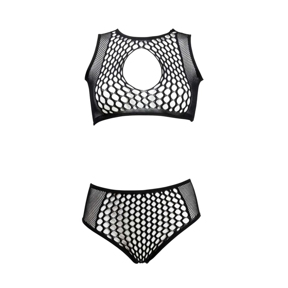 Konstrukcja zestawu wyrożnia się połączeniem kabaretki i siateczki o wzorze ogrodzeniowym, co nadaje całości oryginalnego charakteru. Gorna część to krotki top z subtelnym wycięciem typu keyhole, natomiast dolna to figi z wysokim stanem, ktore świetnie podkreślają linię talii.