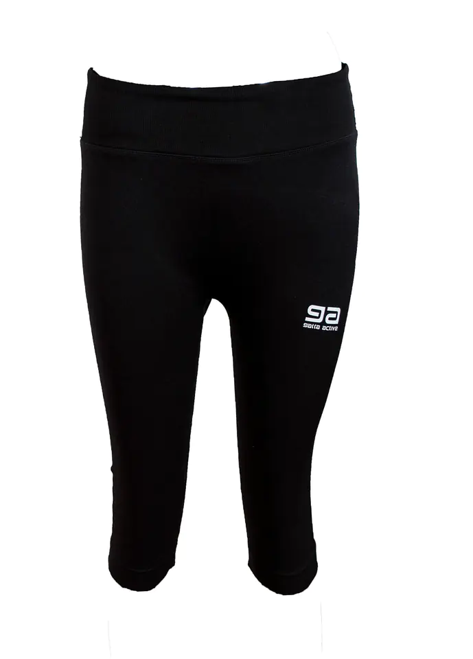 Czarne legginsy z kolorowym pasem o długości 3/4, do każdego rodzaju aktywności sportowej. Wykonane z wysokiej jakości przędzy poliamidowo - poliestrowej, która szybko odprowadza pot, dając uczucie świeżości. Płaskie szwy zapewniają wygodę podczas ruchu.