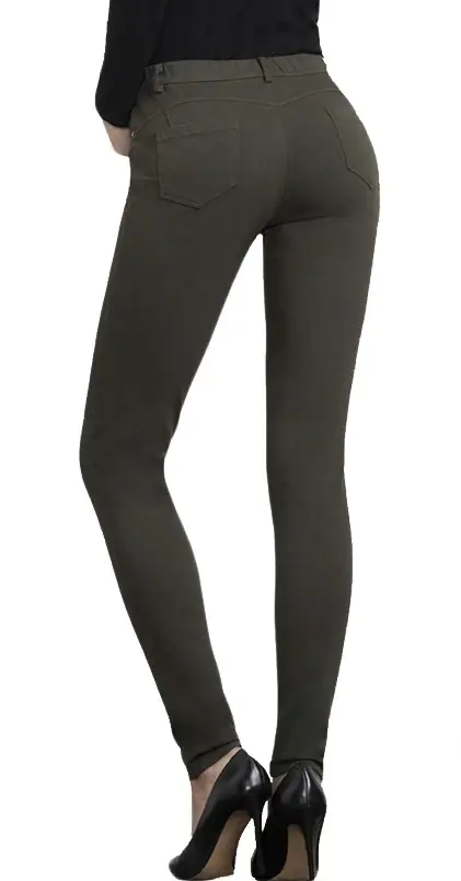 Legginsy damske imitujące spodnie jeansy wykonane z grubej bawełny. Pas ozdobiony guzikiem i szlufkami. Tył z kieszeniami i oryginalnymi przeszyciami. Idealnie dopasowane, elastyczne, wygodne, nie krępują ruchów. Skład: 93% poliamid, 7% elastan.