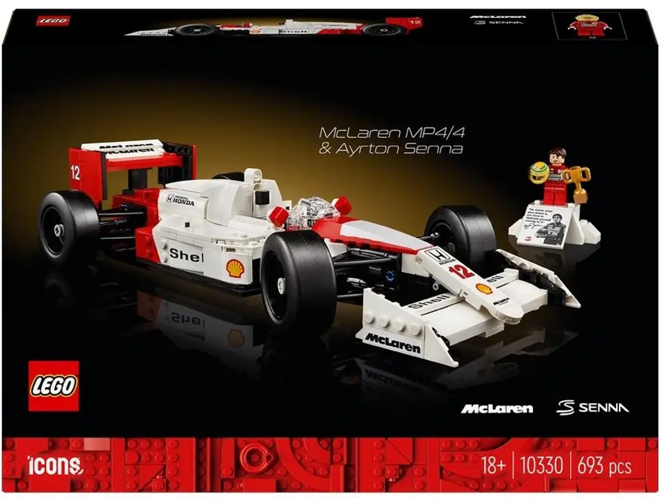 Replika samochodu McLaren MP4/4 ma działający układ kierowniczy, zawieszenie wahaczowe, regulowane tylne skrzydło, opony slicki, lusterka, dźwignię zmiany biegów i szczegółowy silnik V6 turbo. Całość uzupełnia podstawka do ekspozycji z plakietką z ciekawymi statystykami. Minifigurkę Ayrtona Senny można ustawić na podstawce w kształcie podium i dopełnić plakietką z kultowym cytatem kierowcy i jego zdjęciem.