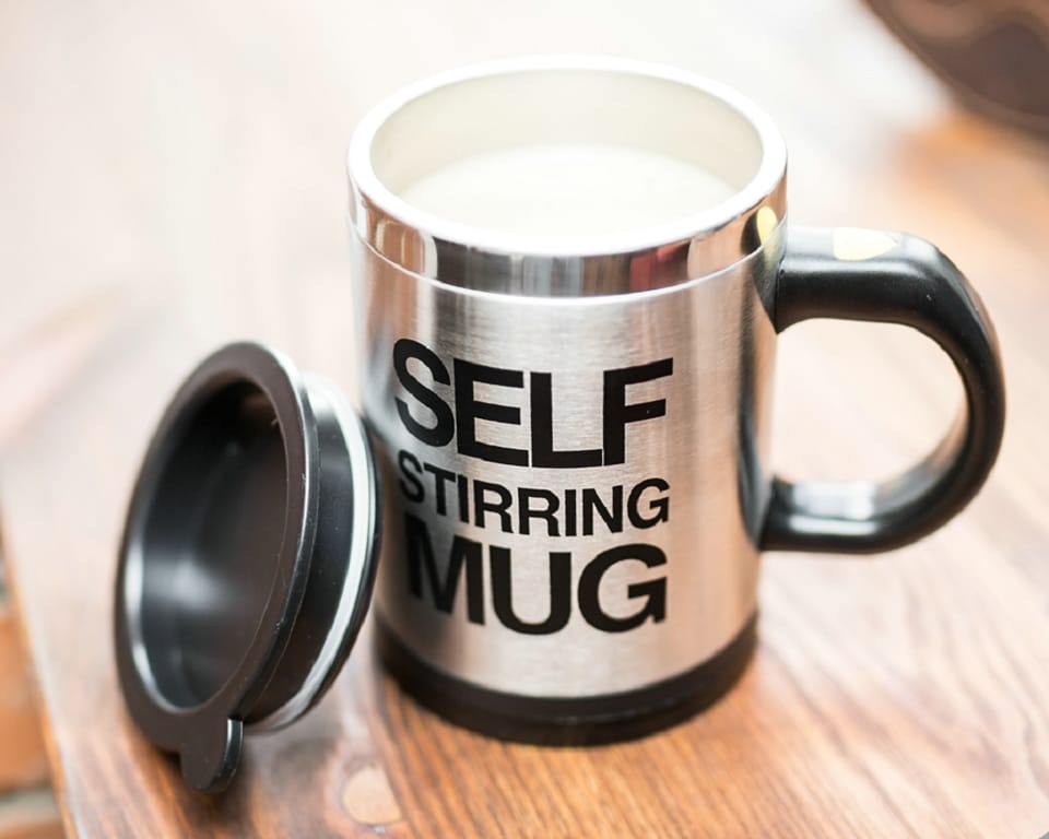Nowa odsłona leniwego kubka, teraz ze środkiem ze stali szlachetnej! Kubek z którego możesz pić gorącą słodzoną kawę lub herbatę, czekoladę lub pyszną zupkę nadający się dla każdego kto lubi wygodne i bez problemowe życie uznający zasadę, że po co robić coś, skoro ktoś może zrobić to za ciebie. Cechą która wyróżnia ten kubek od wszystkich innych jest to, że oprócz dużej ilość gorącego płynu jaki w sobie mieści posiada przycisk umieszczony na uchwycie, który uruchamia małe mieszadełko znajdujące się we wnętrzu naczynia. Jego zadaniem jest wymieszanie znajdującej się w nim zawartości bez konieczności użycia do tego celu łyżeczki.