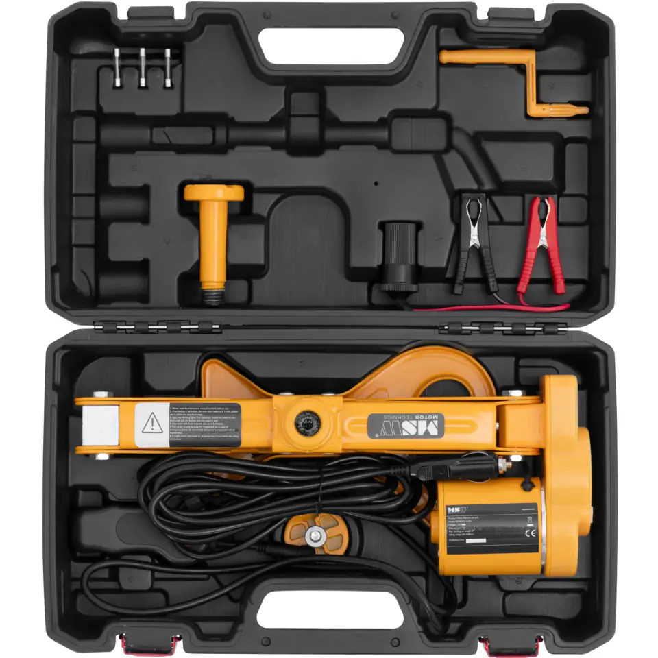 Kod producenta: 10062544Elektryczny podnośnik samochodowy marki MSW pozwoli bezpiecznie podnieść auto w sytuacji awaryjnej. Dostarczany jest w zestawie, który składa się z podnośnika, rękawic, trójkąta ostrzegawczego, zapasowych bezpieczników i innych akcesoriów. Za pomocą narzędzia wygodnie można zmienić koło na poboczu drogi lub parkingu. Praktyczna walizka transportowa i kompaktowe wymiary lewarka sprawiają, że zestaw jest idealny dla mechaników amatorów oraz pracowników pomocy drogowej lub mobilnego serwisu naprawczego. Dzięki podnośnikowi praca będzie szczególnie wydajna, ponieważ urządzenie jest szybko gotowe do użycia. Trójkąt ostrzegawczy jest przymocowany z tyłu obudowy, dzięki czemu przejeżdżający kierowcy wyraźnie widzą, gdzie stoi pojazd. Lewarek łatwo włączyć za pomocą przewodowego pilota zdalnego sterowania. Podnośnik samochodowy podłącza się do gniazdka zapalniczki za pomocą adaptera 12 V. Można też użyć akumulatora samochodowego. W zestawie znajdują się odpowiednie klemy. Po naciśnięciu jednego przycisku podnosi pojazdy o masie całkowitej do 3 ton. Duży udźwig zapewnia wystarczającą swobodę podczas prac konserwacyjnych w różnych autach. Podnośnik samochodowy osiąga wysokość do 42 cm. Zintegrowany manometr pozwala na bieżąco kontrolować ciśnienie robocze. Dodatkowo diody LED na urządzeniu świecą się podczas jego pracy. Wszystkie akcesoria można przechować w praktycznej walizce. Dzięki wgłębieniom na podnośnik, korbę ręczną itp. nie trzeba się martwić, że elementy zestawu będą porozrzucane w środku. Futerał bezpiecznie utrzymuje wszystkie części, chroni je przed brudem, wilgocią i kurzem oraz ułatwia transport całości. Dzięki kompaktowym wymiarom elektryczny podnośnik samochodowy z akcesoriami nadaje się do każdego pojazdu.Cechy produktu: