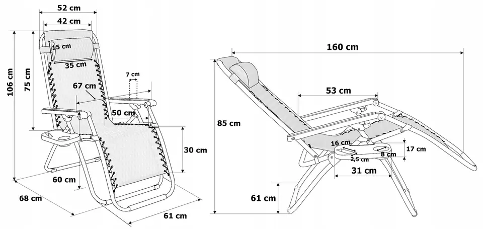 Leżak ogrodowy Orion Zero Gravity beżowyModel: ORION Zero Gravity | Kolor: beżowy⭐Różne kąty nachylenia oparcia⭐Solidne wykonanie⭐Dodatkowy zagłówek i uchwyt na napoje⭐Zakup od producenta Doskonały wybór na działkę, plażę jak i do ogrodu. Leżak bardzo łatwo się rozkłada i składa. Wykonany z materiałów, które zapewniają wieloletnie użytkowanie bez konieczności naprawy czy wymiany na nowy. Stelaż oraz obszycie są solidne i wytrzymałe. Orion posiada możliwość ustawienia pozycji oparcia pod różnym kątem nachylenia. W zaledwie 3 sekundy w prosty sposób zapewnisz sobie pełną wygodę. Dodatkowym atutem leżaka jest gratisowy uchwyt na napoje.Cechy produktusolidny stelażwytrzymałe obszycieszybka zmiana pozycjiłatwy w złożeniu i rozłożeniuróżne kąty nachylenia oparciaudźwig 120 kgwaga 7 kgwygodne zagłówkidodatkowa tacka na napojekomfortowe podłokietnikimocny, oddychający, łatwy w czyszczeniu materiał Textilenełatwy w transporciemocne wiązania materiałuwygodny podnóżek, ułatwiający regulację pozycji Wymiary produktu Złożone:głębokość 15 cmszerokość 67 cmdługość 85 cmRozłożone:szerokość 67 cmsiedzisko 42 x 50 cmoparcie 42 x 75 cmPozycja siedząca:wysokość 106 cmszerokość 67 cmdługość 68 cmPozycja leżąca:wysokość 85 cmszerokość 67 cmdługość 160 cm Informacje dodatkowePrzedstawione kolory należy traktować poglądowo - mogą odbiegać od rzeczywistych ze względu na różne ustawienia monitorów oraz proces obróbki zdjęć. Rzeczywiste wymiary mogą się różnić od podanych wyżej. Tolerancja błędów może wynosić +/- 5%. Marka:eHokeryKod EAN produktu:5905523061345Kolor:beżowyMateriał podstawy:stal + PPMateriał siedziska:textilenePrzeznaczenie:ogród | plaża | działka | taras | balkon | kempingMaksymalne obciążenie:120 kg