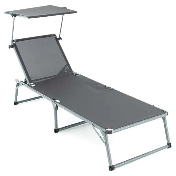 Leżak składany z baldachimem antracytowy XXL 192x66x31 cm Składane łóżko z 5-stopniową regulacją i wygodną powierzchnią do leżenia. Odchylany dach jest praktycznym kloszem i można go indywidualnie regulować.Leżak pokryty jest łatwym w pielęgnacji, wodoodpornym 2x2 Textilene 600g poliestru. Stabilna szara aluminiowa rama z trzema nogami jest wyjątkowo wytrzymała. Antypoślizgowe nóżki z ochronnymi nakładkami zapewniają również stabilne trzymanie.Łóżko jest składane i przez co można je schować, aby zaoszczędzić miejsce. Dzięki temu można go również łatwo transportować. Specyfikacja: Wymiary: 192x66x31 cm Wymiary po złożeniu: 80x66x17 cm Wymiary daszku: 57x51 cm 5-stopniowa regulacja oparcia Kolor: antracytowy (ciemnoszary) Maksymalne obciążenie: 120 kg