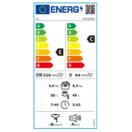 LG Pralka z suszarką F2DV5S8S0 Klasa efektywności energetycznej C, Ładowanie od przodu, Wydajność prania 8,5 kg, 1200 obr./min,