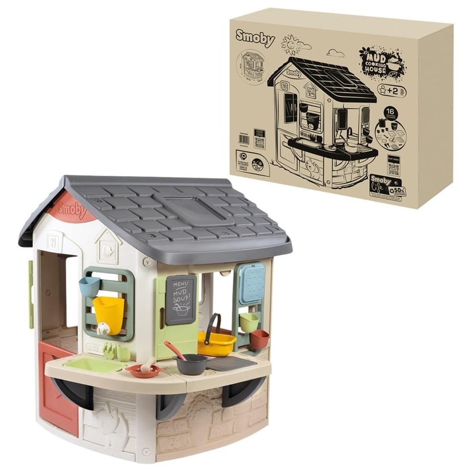 Smoby Life Domek z kuchnią błotną\nUroczy domek z kuchnią błotną. Podwójny blat roboczy, 2 duże wyjmowane tace ze zbiornikiem na wodę (1L). 16 akcesoriów w tym sitko, koszyczek, narzędzia ogrodowe, akcesoria kuchenne. 50% użytego do produkcji domku plastiku pochodzi z recyklingu. Odporna i stabilna konstrukcja. Powłoka ANTI-UV chroniąca przed blaknięciem kolorów na słońcu. Wymiary: 143,9x139,6x132,1 cm, Wyprodukowany we Francji, 2l+