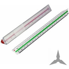 Skalówka z białego ABS, nadrukowane 6 precyzyjnych skal 1:20/25/33/50/75/100, długość skal 30 cm, malowane 2 rowki pomiędzy skalami, transparentne, plastikowe etui