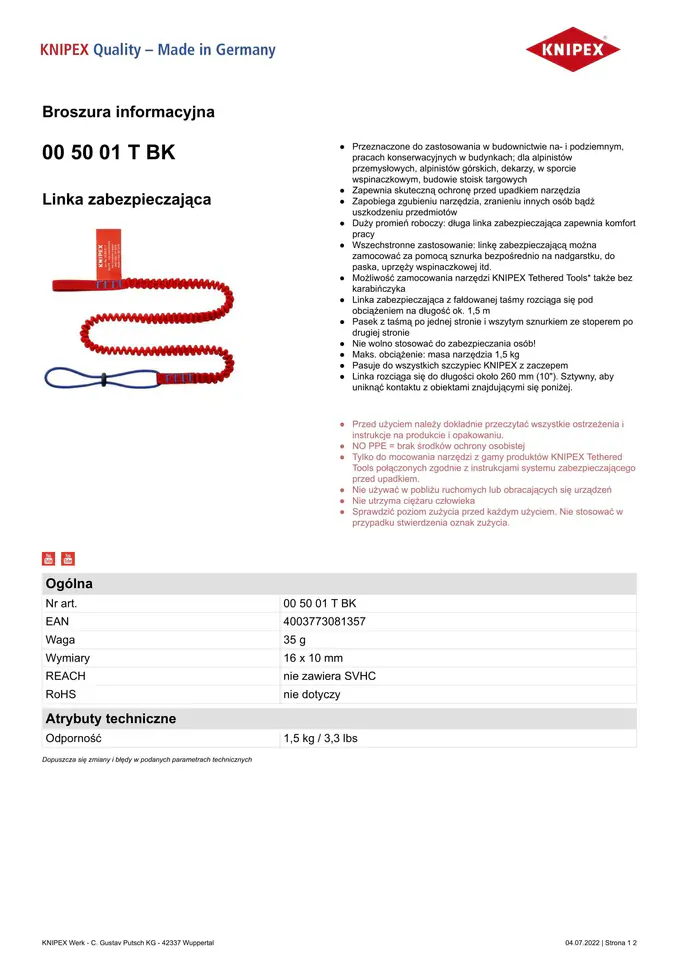 Tylko do mocowania narzędzi z gamy produktów KNIPEX Tethered Tools połączonych zgodnie z instrukcjami systemu zabezpieczającego przed upadkiem.