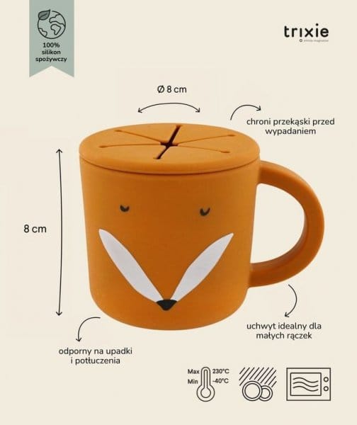 Ten sprytny silikonowy kubek z wesołym zwierzakiem zaprojektowany został z myślą o maluchach uwielbiających smakowite przekąski. Elastyczna pokrywka zabezpiecza przekąski przed wypadaniem i ma idealne proporcje dla małych rączek, a zaokrąglone ucho jest wygodne do uchwycenia. Kubek wykonany jest z wytrzymałego, 100% silikonu spożywczego, który jest miękki w dotyku, nie pęka po upuszczeniu i nadaje się do użytku w kuchence mikrofalowej, piekarniku, zamrażarce i zmywarce.Cechy: - wyjątkowy design- elastyczna pokrywka- idealne proporcje dla małych rączek- miękki w dotyku- odporny na upadki i pękanie- podgrzewanie w mikrofalówce i piekarniku- mycie w zmywarce- łatwy w czyszczeniu Materiał:100% silikon spożywczy Zalecany wiek:4 miesiące+Wymiary:11 x 8 x 8 cm...
