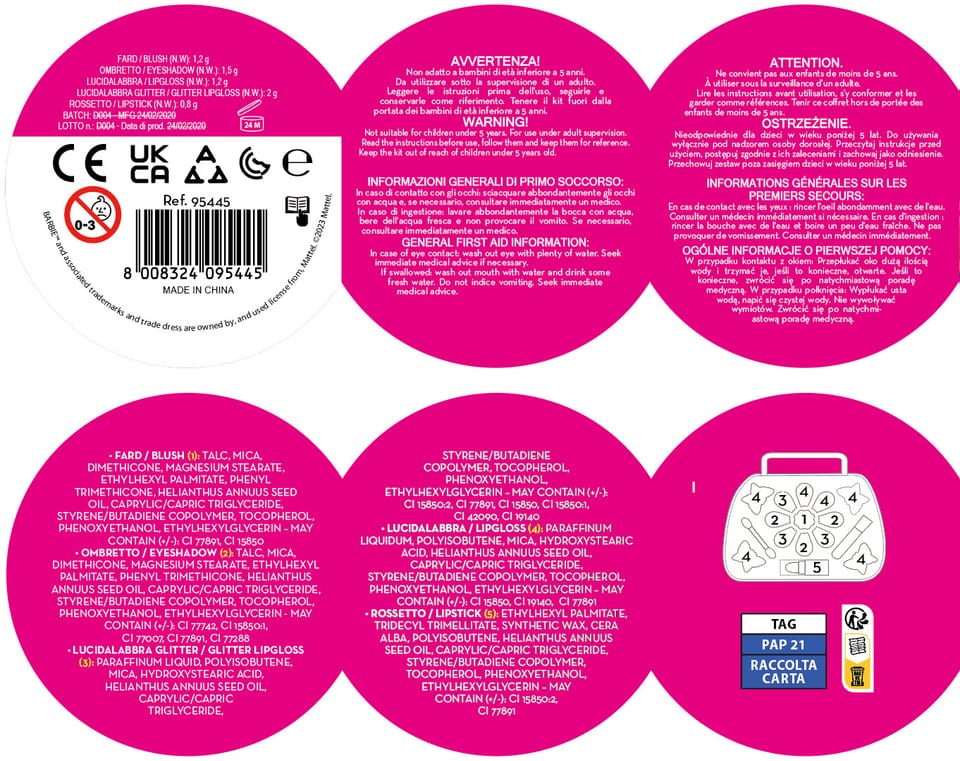 Zestaw do makijażu, który pozwoli na codzienne upiększenie! Wszystkie kosmetyki są certyfikowane - błyszczyk, róż, cienie do powiek. Dodatkowo w zestawie znajduje się wiele brokatu, który nada makijażowi dodatkowego blasku. Całość zamykana jest w poręcznej walizeczce, którą łatwo można ze sobą zabrać - występuje ona w dwóch wersjach. Istnieje możliwość zamówienia produktu z dodatkowym displayem, który mieści 12 sztuk produktu (po 6 w kolorze).