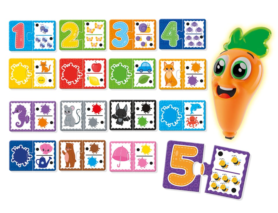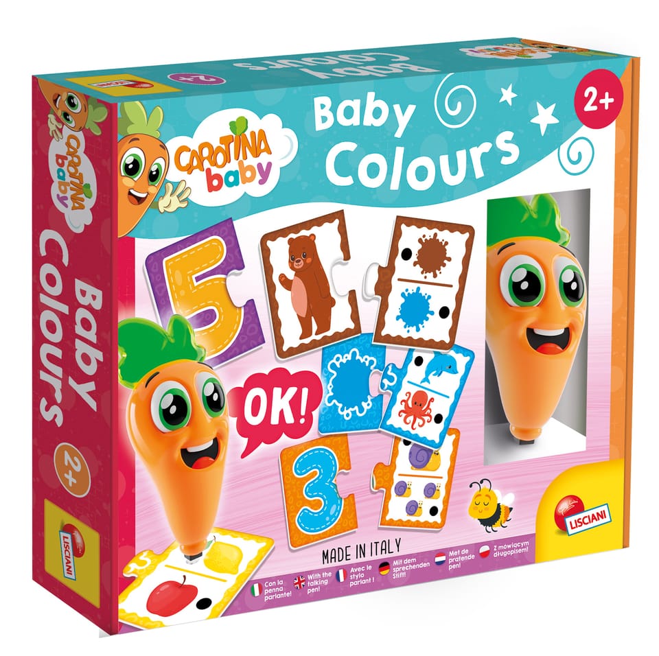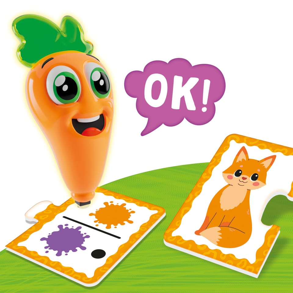 Interaktywny produkt do poznawania kolorów przez zabawę w formie quizów. Dzieciom towarzyszy Carotina, która przy każdej poprawnej odpowiedzi radosnymi okrzykami zachęca dzieci do dalszej zabawy. Elementy wykonane z grubej i odpornej na ślinę tektury pozwalają najmłodszym lepiej poznać kolory dzięki logicznym skojarzeniom.