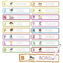 | Zawartość zestawu: | Plansza z ilustracjami zwierząt Specjalny zmazywalny mazak Karty z literami Podręcznik |