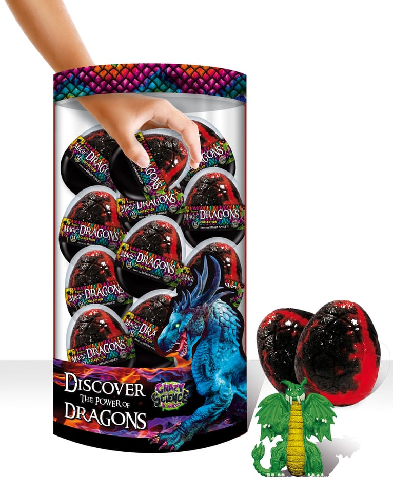 Do zebrania wszystkie smoki, które składają się na tę fantastyczną kolekcję. Każdy z nich posiada wyjątkową magiczną moc! Należy wykluć jajko i przekształcić nowonarodzonego smoka w wisiorek do powieszenia lub noszenia, za pomocą narzędzi zawartych w specjalnym przezroczystym opakowaniu.
