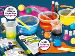 Fascynujący, a zarazem ohydny zestaw, z którym dzieci stworzą zabawne i kreatywne rzeczy z klejącej się masy m.in. skaczące piłeczki, komórki potworów, ruchome piaski, ciągnącą galaretkę czy zabawną plastelinę. Produkt zawiera bezpieczne odczynniki. Uwaga! gluty zmieniają kolory i podskakują! Zawartość: ochronne okulary, pipeta, szpatułki, odczynniki, barwniki, miarki, butelka, probówki.