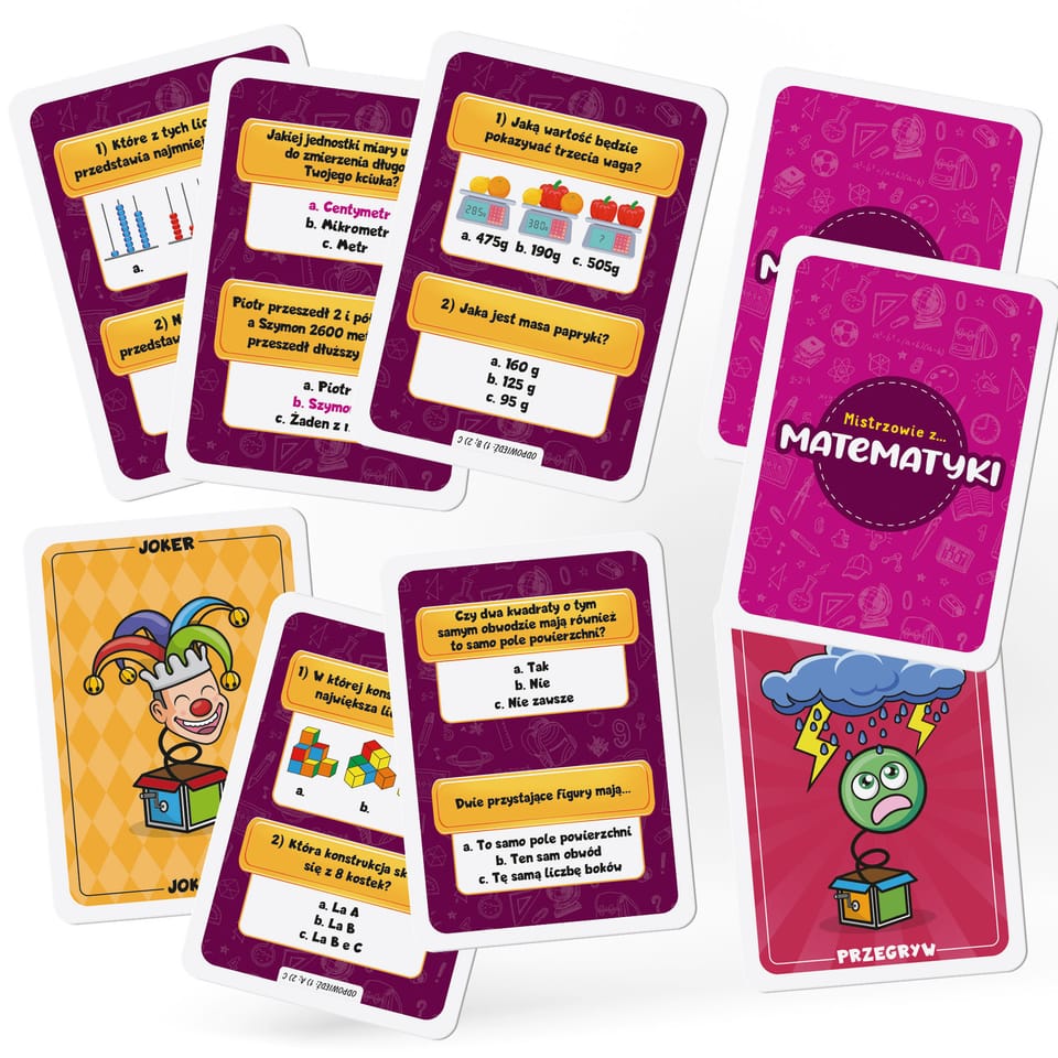 Mistrzowie z... to edukacyjna gra karciana, w którą może grać od 2 do 4 graczy. Jedna partia trwa około 20 minut. Wygrywa ten gracz, który jako pierwszy zdobędzie 5 kart, poprawnie odpowiadając na pytania.Mistrzowie z… to wyjątkowa kolekcja gier edukacyjnych dla dzieci! W opakowaniu znajduje się wiele zabawnych quizów z bardzo prostymi zasadami, które zostały opracowane na podstawie programu szkoły podstawowej. Na co czekasz? Weź udział w wyzwaniu z przyjaciółmi i zostań niekwestionowanym MISTRZEM!Cała seria składa się z 6 tematycznych tytułów: POLSKIEGO, ANGIELSKIEGO, GEOGRAFII, MATEMATYKI, NAUK PRZYRODNICZYCH oraz PALEONTOLOGII.