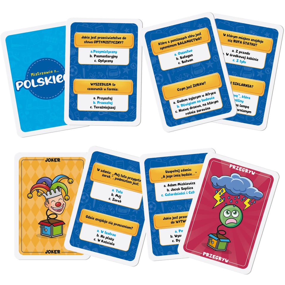 Mistrzowie z... to edukacyjna gra karciana, w którą może grać od 2 do 4 graczy. Jedna partia trwa około 20 minut. Wygrywa ten gracz, który jako pierwszy zdobędzie 5 kart, poprawnie odpowiadając na pytania.Mistrzowie z… to wyjątkowa kolekcja gier edukacyjnych dla dzieci! W opakowaniu znajduje się wiele zabawnych quizów z bardzo prostymi zasadami, które zostały opracowane na podstawie programu szkoły podstawowej. Na co czekasz? Weź udział w wyzwaniu z przyjaciółmi i zostań niekwestionowanym MISTRZEM!Cała seria składa się z 6 tematycznych tytułów: POLSKIEGO, ANGIELSKIEGO, GEOGRAFII, MATEMATYKI, NAUK PRZYRODNICZYCH oraz PALEONTOLOGII.