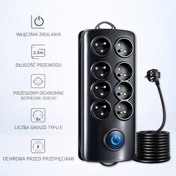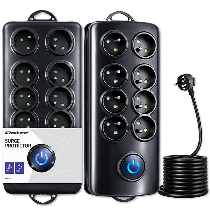 Listwa antyprzepięciowa marki Qoltec posiada gniazda sieciowe z uziemieniem, które umożliwiają podłączenie pełnowymiarowych wtyczek europejskich, kabel oraz organizer na kabel. Elegancki design oraz podświetlany włącznik nożny typu Quick Switch zapewniają komfortowe użytkowanie. Listwa wykonana jest z niepalnego tworzywa, a dzięki zabezpieczeniu przeciw przepięciom, które występują w sieci energetycznej, zapewni ona bezpieczeństwo podłączonych do niej urządzeń. Posiada nie tylko zabezpieczenie przed przepięciami, ale również zabezpieczenie przed dostępem dla dzieci. Listwa antyprzepięciowa przeznaczona jest do użytku zarówno w domu jak i w pracy, ale również do użytku w warsztatach, sklepach oraz w innych miejscach, w których niezbędne jest podłączenie kilku urządzeń jednocześnie. Dodatkową zaletą jest możliwość zamontowania listwy na meblach. Produkt posiada ubezpieczenie.
