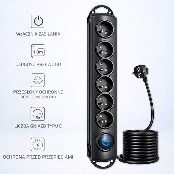 | Dodatkowe informacje: | Podświetlany włącznik nożny | Organizer kabla | Możliwość montażu na meblach | Zabezpieczenie przed dostępem dla dzieci |