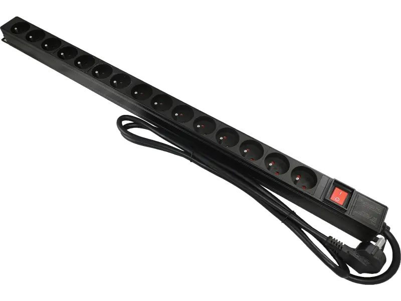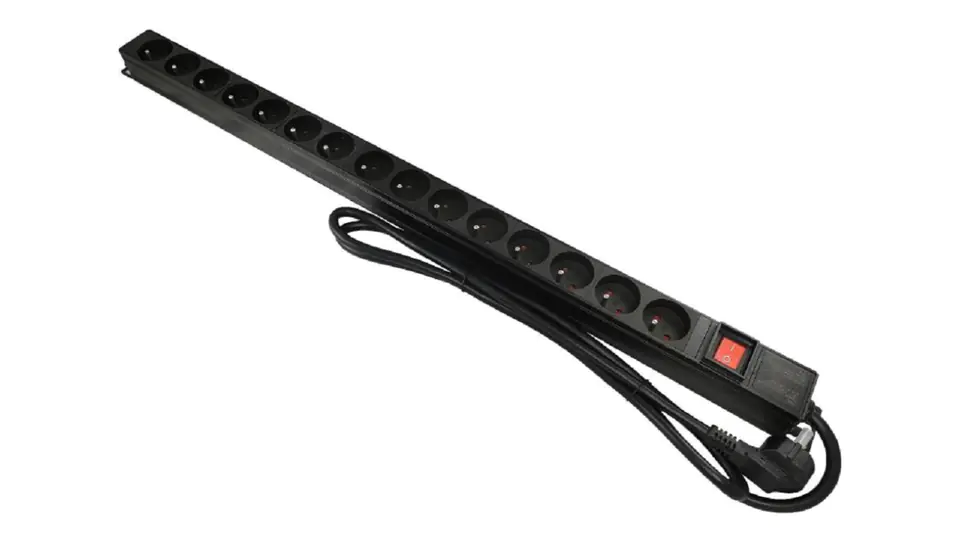 Listwa zasilająca do instalacji w szafach rack wykonana ze stopu aluminium malowanego na kolor czarny, gniazda są wykonane z wytrzymałego ABS. Podświetlany wyłącznik pozwala na szybkie odłączenie zasilania od wszystkich gniazd. Do listwy dołączony jest zestaw śrub mocjących wraz z koszyczkami i podkładkami.