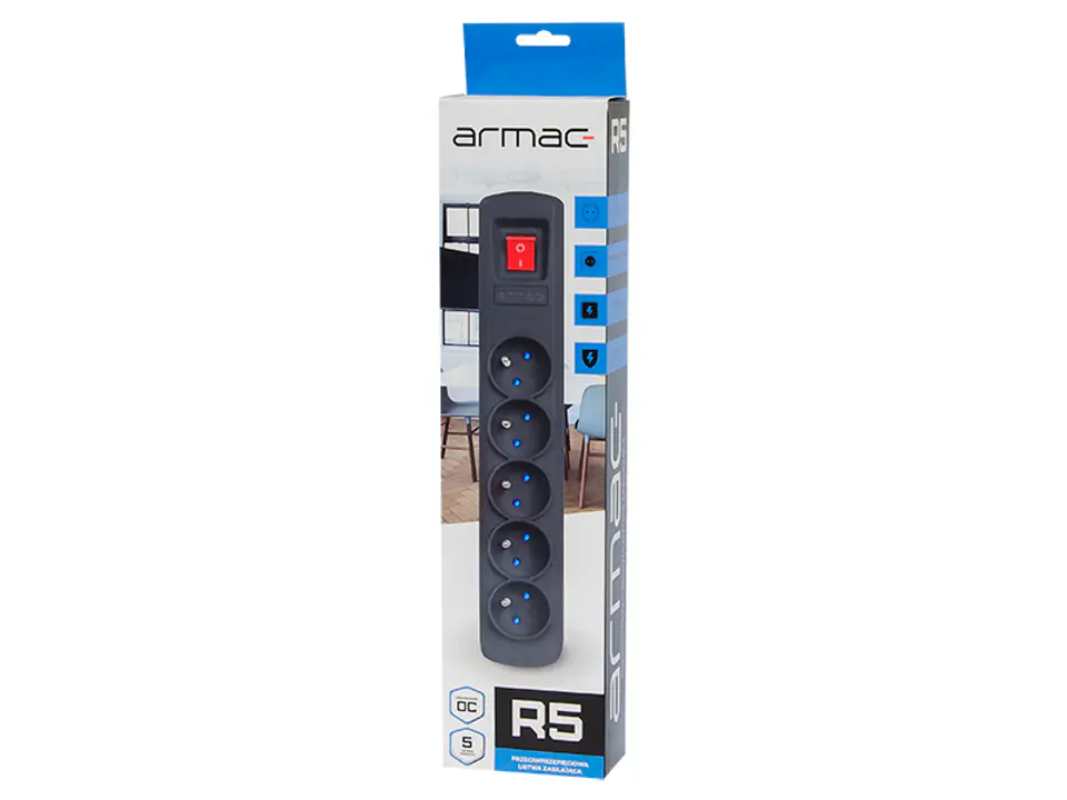 Produkt posiada specjalny system do ochrony przeciwzwarciowej i przeciwprzepięciowej. Zastosowany bezpiecznik automatyczny o działaniu zwłocznym, który nie wymaga wymiany jest doskonałą ochroną. Dodatkowo listwa posiada wbudowane przesłony ochronne gniazd sieciowych.Wysokiej klasy warystor o szybkim czasie działania poniżej 25 nanosekund i wysokiej wartości pochłanianego impulsu 6000A, chroni urządzenie przed niebezpiecznymi skokami napięcia. R5 nie zajmuje dużo miejsca i w połączeniu z możliwością montażu do podłoża, jest produktem uniwersalnym o szerokim wachlarzu zastosowania. Zabezpiecza przed zwarciami, jak i niebezpiecznymi skokami napięcia urządzenia elektroniczne w domu i w biurze.5 gniazd z uziemieniemszybki bezpiecznik automatycznysystem przeciwprzepięciowyprzesłony ochronne gniazd sieciowych