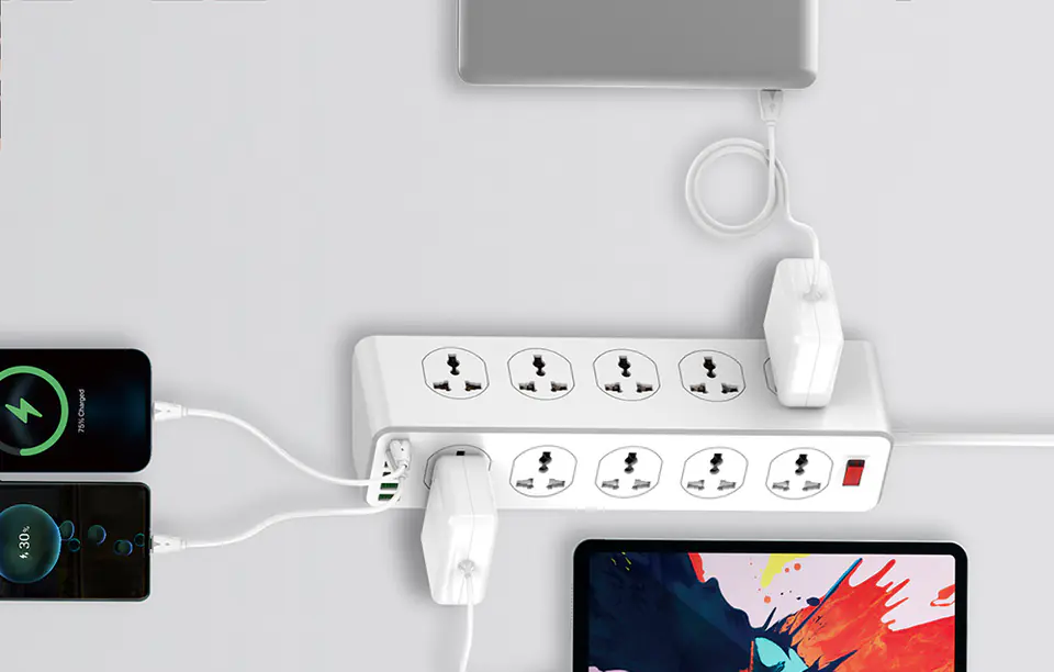 LDNIO SC10610 to urządzenie, które umożliwia zasilanie sprzętów elektrycznych z wtyczkami różnych standardów EU, US lub UK. Dodatkowo pozwala na szybkie i wygodne ładowanie akumulatorów w urządzeniach przenośnych takich jak smartfony, tablety czy też inne gadżety. Listwa zasilająca jest wyposażona w 1 port USB-C, 1 port USB QC 3.0 oraz 4 porty USB Auto-ID, dzięki czemu można do niej podłączyć większość popularnych urządzeń. Jednocześnie można zasilać aż 16 urządzeń. Ładowarka posiada również funkcje PD i Quick Charge 3.0, co oznacza, że urządzenie jest w stanie szybko i efektywnie naładować akumulatory o dużej pojemności. Listwa zasilania posiada kabel o długości 200 cm.