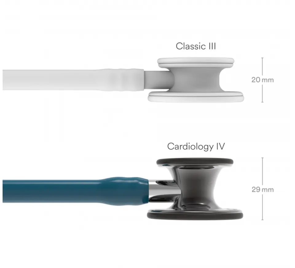 Stetoskopy marki Littmann Littmann Cardiology IV Stetoskop diagnostyczny Odpowiedni do diagnozowania schorzeń, takich jak zwężenie aorty, szmery tonu trzeciego (S3) oraz ledwie słyszalne anomalie płucne. Cechy: Do stosowania także na oddziale ratunkowym, oddziale intensywnej terapii, oddziale intensywnej terapii kardiologicznej oraz oddziale terapii półintensywnej Wysoki profil i ergonomiczny kształt; o 40% większa głowica i o 60% głębszy lejek niż w stetoskopie 3M™ Littmann® Classic III™ Zastosowanie u dorosłych i dzieci Regulowana dwustronna głowica ze stali nierdzewnej z otwartym lub zamkniętym lejkiem Ciepła obwódka Miękkie oliwki Dwustronna głowica Littmannn Cardiology IV posiada dwustronną głowicę: dużą membranę o rozmiarze 43mm, oraz małą membranę pediatryczną 34mm. Pediatryczna strona głowicy zmienia się w tradycyjny otwarty lejek (przy zdjęciu dwutonowej membrany i założeniu gumowego rękawa). Zarówno pediatryczna jak i internistyczna strona głowicy mają jednoczęściowe membrany, które można łatwo odczepiać, przyczepiać i czyścić. Konstrukcja głowicy opracowana jest maszynowo ze stali nierdzewnej. Głowica wykonana z lekkiego stopu aluminium. Technologia dwutonowej membrany umożliwia klinicystom osłuchiwanie dźwięków o różnych częstotliwościach przez dostosowywanie nacisku na klatkę piersiową. Przyłożenie głowicy z małą siłą umożliwia nam usłyszenie dźwięków o niskiej częstotliwości, wywarcie odrobinę większej siły pozwala usłyszeć dźwięki o wyższej częstotliwości. Lira z podwójnym światłem przewodu Przewód jest bezlateksowy. Posiada zwiększoną odporność na lipidy skórne ,alkohol oraz zabrudzenia. Podwójne światło przewodu eliminuje zakłócenia dźwięków występujące w tradycyjnych stetoskopach. Lira wykonana z stopu wykorzystywanego w lotnictwie (Anodowane aluminium). Prezentowany model to 3M™ Littmann® Cardiology IV™ z wykończeniem w kolorze high polish smoke. Przewód błękitny. Trzon lustrzany. Lira czarna. Model: 6234