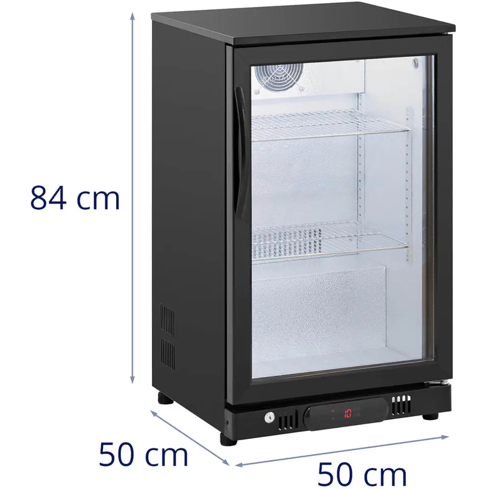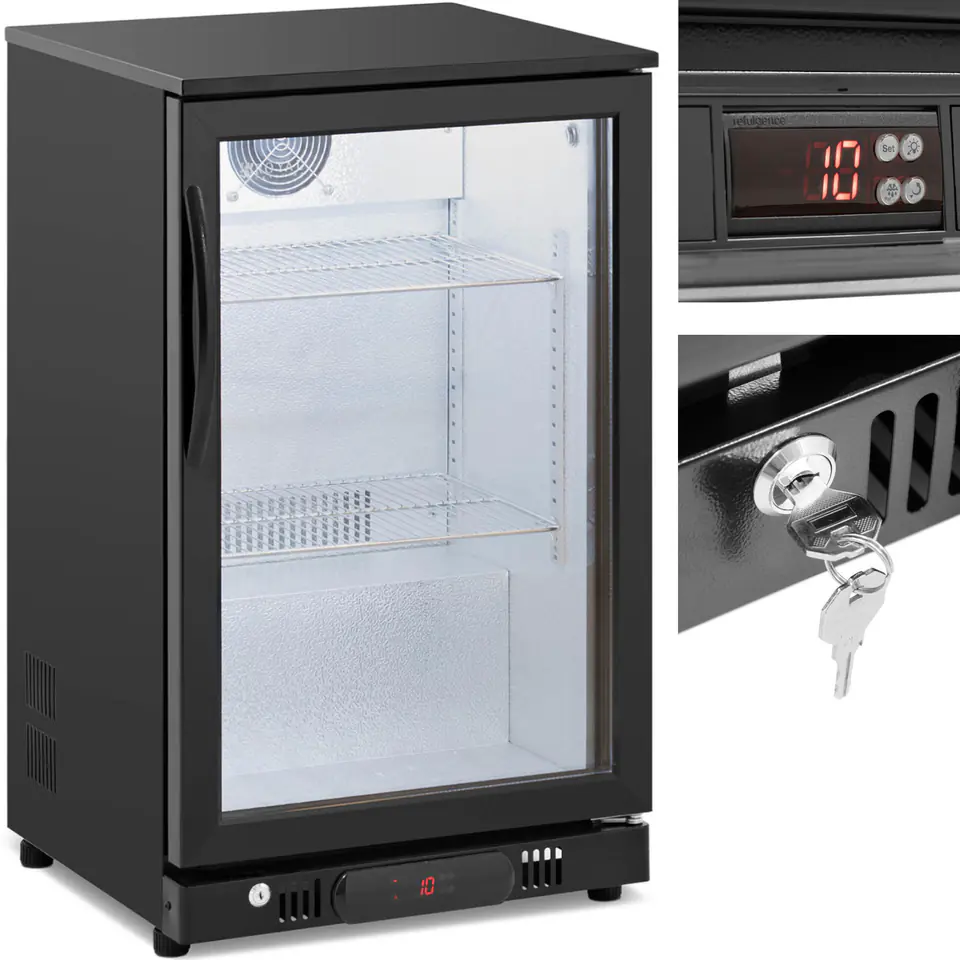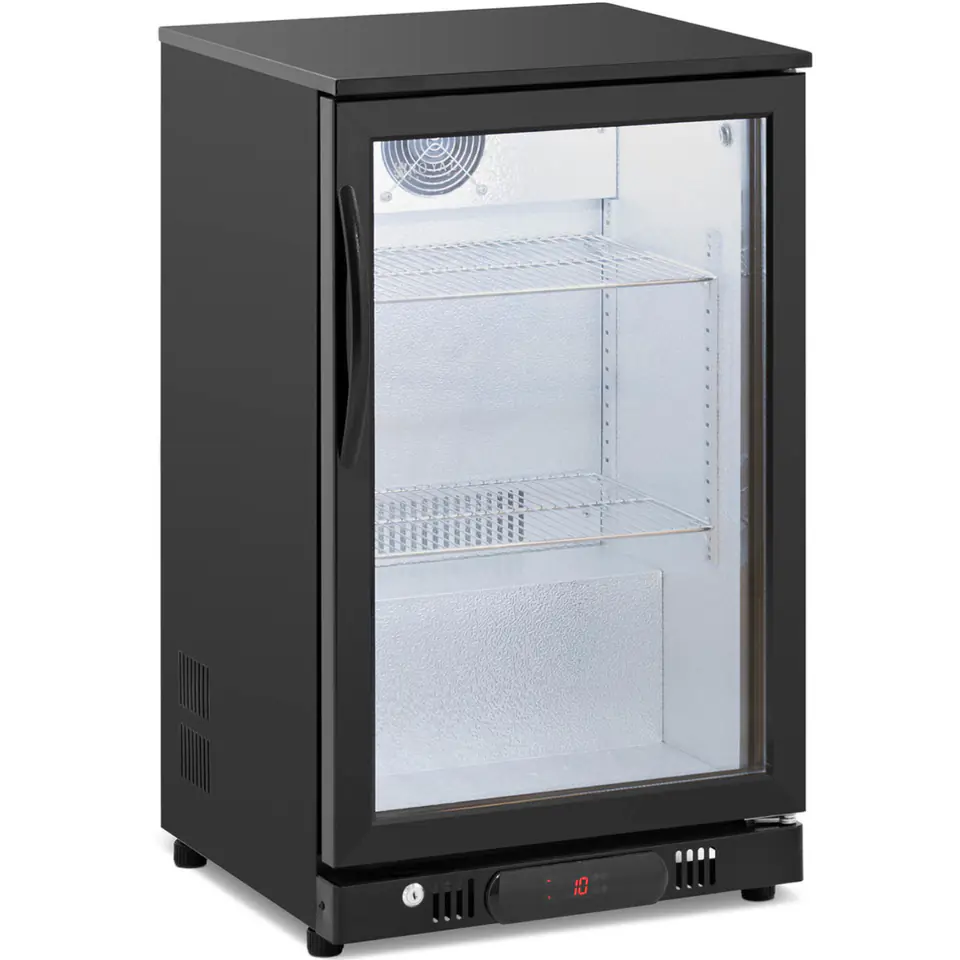 Lodówka na napoje marki Royal Catering sprawdzi się do chłodzenia wody, soków, napojów bezalkoholowych czy alkoholi. Urządzenie ma pojemność 108 l. Wyposażone zostało w 2 półki, mieszczące butelki i puszki w różnych rozmiarach. Lodówka posiada regulację temperatury w zakresie 2-10°C. Oświetlenie LED zapewnia atrakcyjną prezentację produktów. Drzwi urządzenia wykonano z dwuściennego hartowanego szkła, wyraźnie eksponują napoje, są także zamykane na klucz. Wnętrze wykonane zostało z tłoczonego aluminium a obudowa zewnętrzna ze stali malowanej proszkowo. Regulowane nóżki zapewniają stabilność nawet na nierównej powierzchni.
