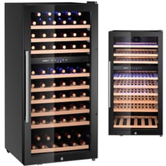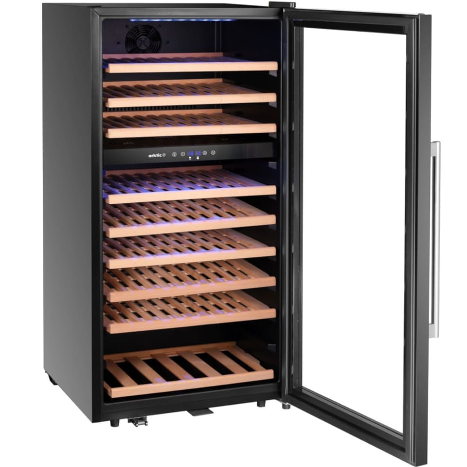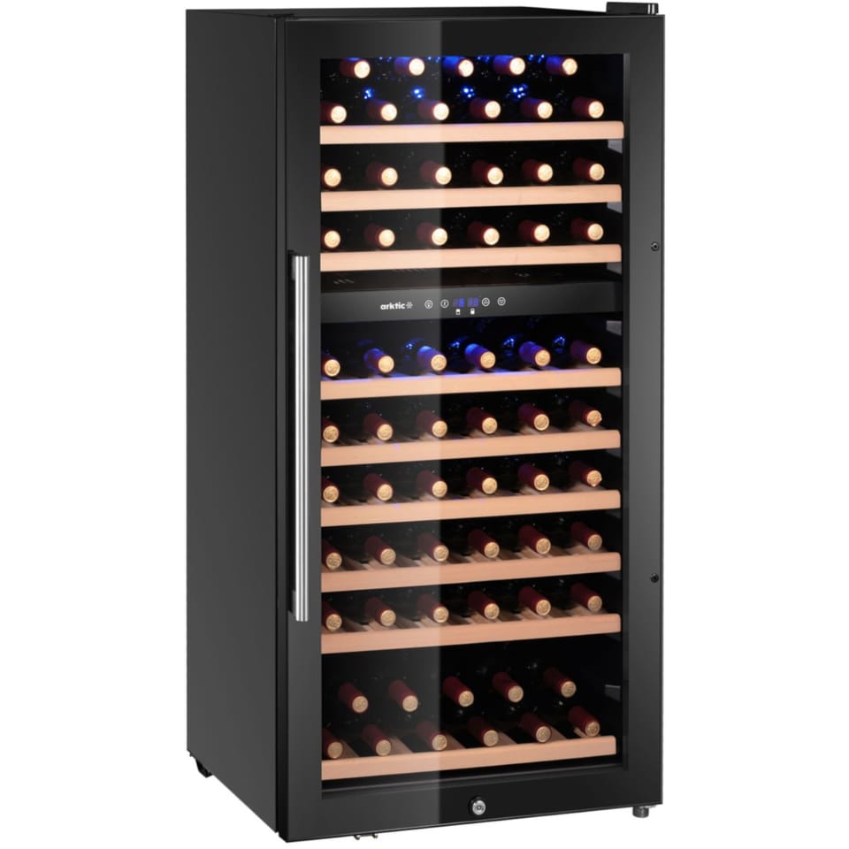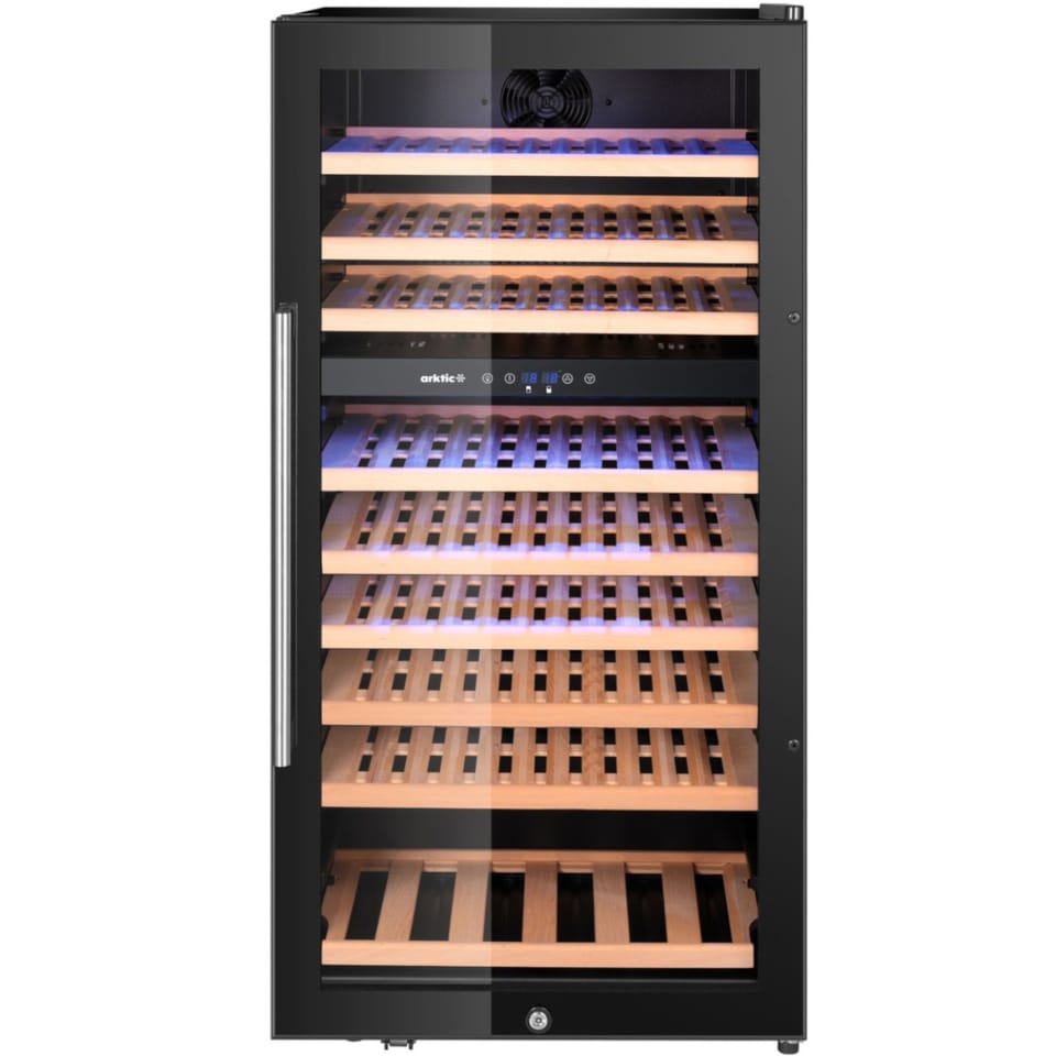 Kod producenta: 1030806Lodówka do wina 2-strefowa Arktic posiada dwie strefy chłodzenia z niezależną regulacją temperatury. Nadaje się do przechowywania do 91 butelek (spiętrowanych). Obudowa została wykonana ze stali nierdzewnej malowanej proszkowo na czarno. Drzwi z hartowanego szkła bez obramowania posiadają uchwyt ze stali nierdzewnej oraz zamek z kluczykiem. Wysuwane półki z drewna bukowego są odporne na zmiany poziomu wilgotności. Lodówka posiada funkcję automatycznego odszraniania, cyfrowy wyświetlacz oraz elektroniczny termostat. Wewnętrzne niebieskie oświetlenie LED idealnie nadaje się do efektownej ekspozycji win.Cechy produktu: