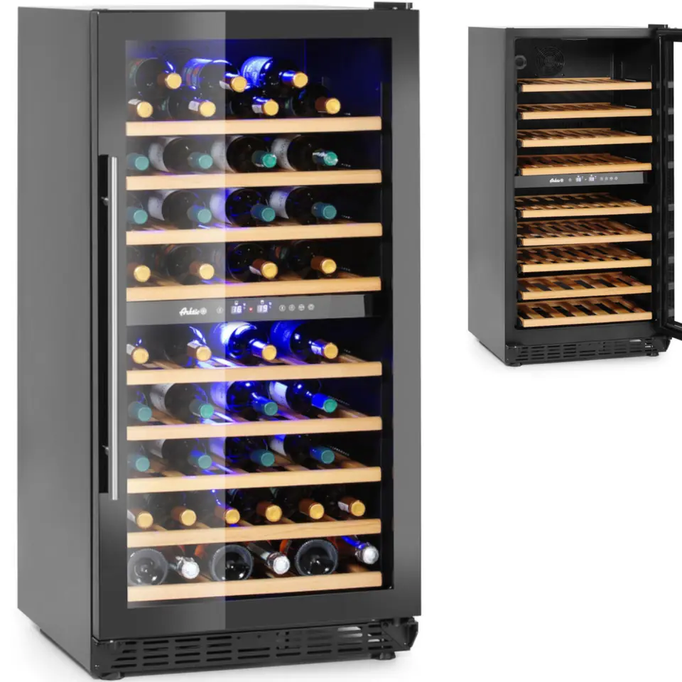 Kod producenta: 237557Lodówka do wina marki ARKTIC to wydajne urządzenie chłodnicze przeznaczone do długotrwałego przechowywania i ekspozycji butelek wina. Idealnie nadaje się do przechowywania trunków takich jak: Bordeaux, Cabernet Sauvignon, Shiraz, Porto, Madeira, a także Champagne Non Vintage, Prosecco, Cava, Asti. Lodówka o pojemności 232 l, a na 9 drewnianych półkach pomieści 72 butelki wina. Chłodziarka została wyposażona w cyfrowy wyświetlacz i elektroniczny termostat, który umożliwia precyzyjne ustawienie temperatury w zakresie od 5deg;C - 22deg;C. Dzięki podziałowi na dwie strefy chłodzenia z możliwością ustawienia różnych temperatur w każdej z nich, w jednym czasie można przechowywać różne gatunki win. Zastosowanie wentylatora sprawia, że chłodne powietrze rozprowadzane jest po całej komorze. Obudowa lodówki została wykonana ze stali malowanej proszkowo na czarno, dzięki czemu jest odporna na uszkodzenia mechaniczne. Obie chłodziarki zostały wykonane ze szkła hartowanego, co ogranicz utratę temperatury i daje gwarancje znacznej wytrzymałości. Cechy produktu:
