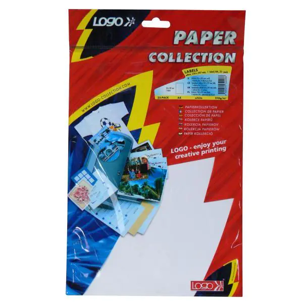 Logo etykiety 210mm x 297mm, A4, matowe, białe, 1 etykieta, 140g/m2, pakowane po 25 szt., do drukarek atramentowych i laserowych