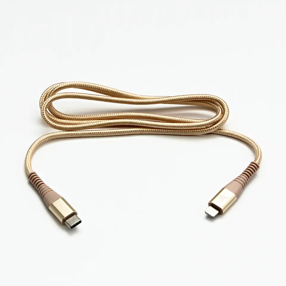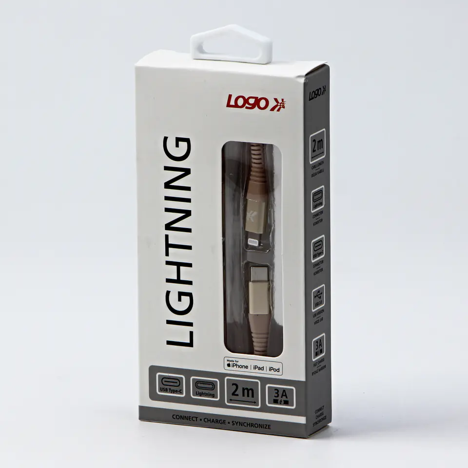 Logo USB kabel (2.0), USB C M) - Apple Lightning M, 2 m, certyfikat MFi, złoty, box, oplot nylonowy, aluminiowa osłona złącza, EO