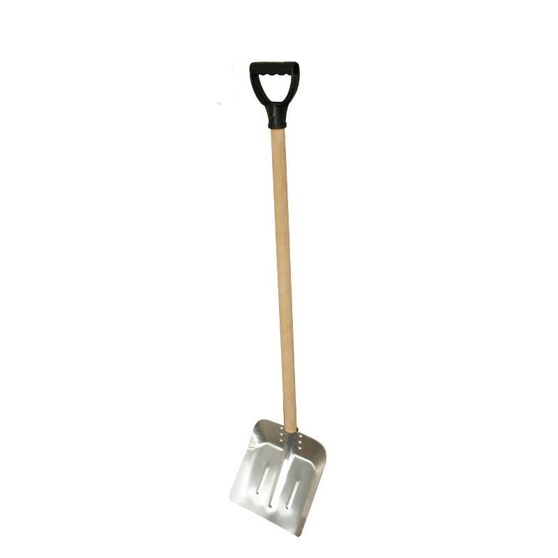 Lekka i wytrzymała łopata aluminiowa z drewnianym trzonkiem.