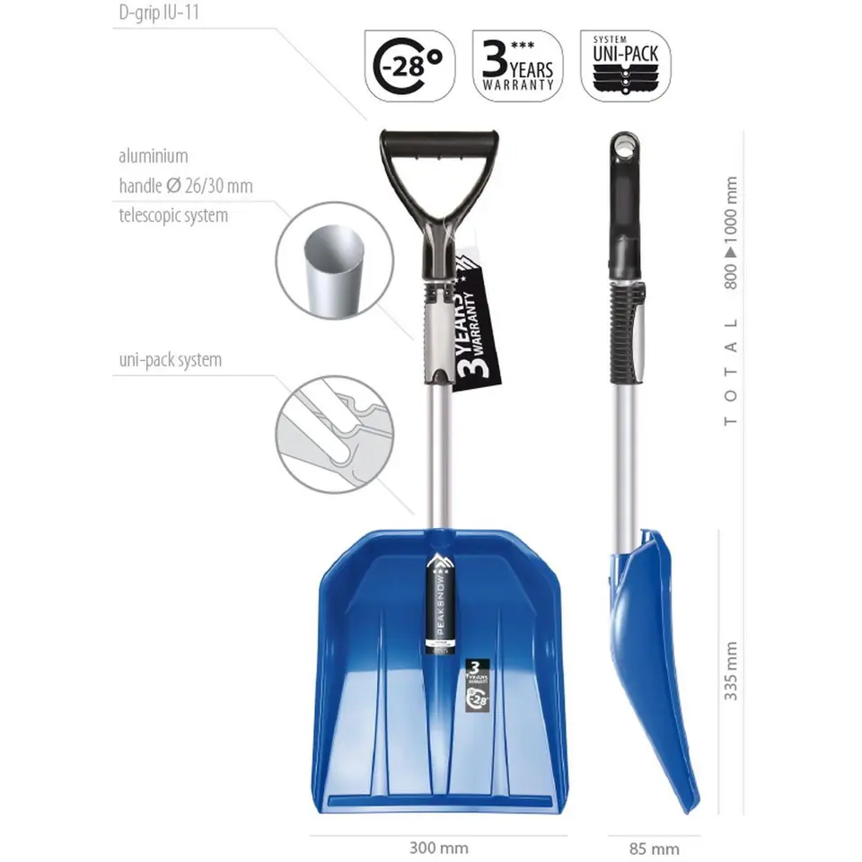 - wyprodukowana z materiału o bardzo dobrej odporności na pękanie i niskie temperaturyregulowany sztyl pozwoli na dopasowanie długości do wykonywanych pracergonomiczna budowa dopracowana pod względem wytrzymałości oraz wydajnościspecjalna mocna blokada nie pozwoli łopacie samoczynnie rozsunąć sięodporna na zmienne warunki atmosferyczne, nie zardzewiejełatwa w przechowywaniu, dzięki teleskopowej konstrukcji zajmuje mało miejscaświetna do szybkiej i dokładnej pracy dzięki innowacyjnej zwężonej krawędzi natarcia