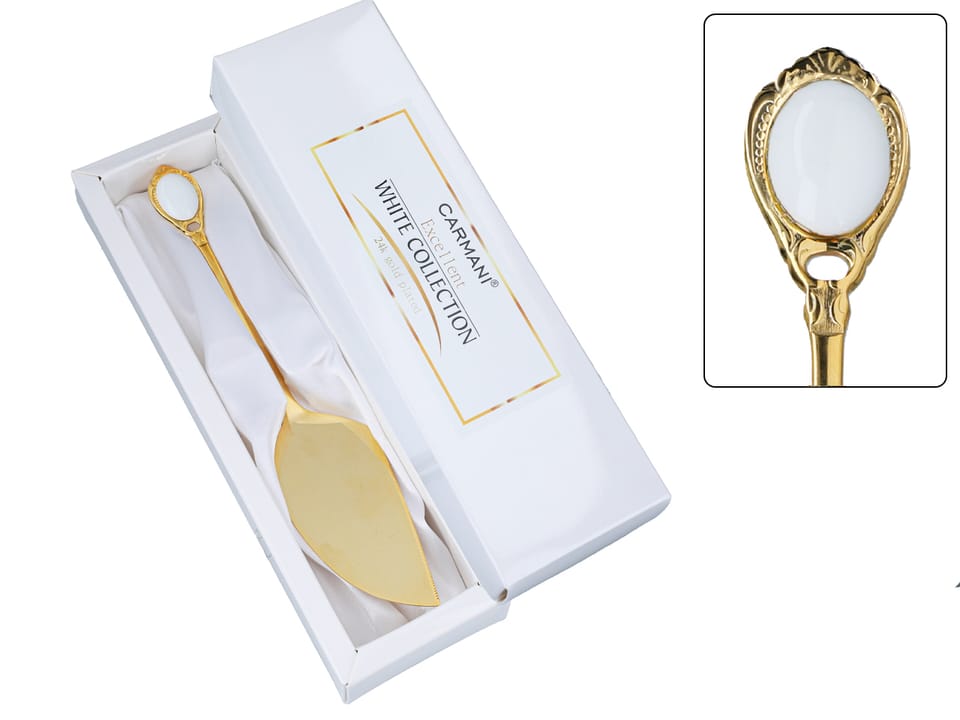 Złota łopatka do ciasta łączy elegancję z funkcjonalnością. Wykonana z wysokiej jakości, ułatwia serwowanie wypieków, a jej luksusowy wygląd doda uroku każdej okazji.