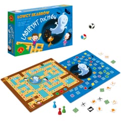 Łowcy Skarbów to dynamiczna i emocjonująca gra planszowa. Aby odnieść zwycięstwo gracze muszą wykazać się spostrzegawczością i świetną pamięcią wzrokową. Jednak element losowości sprawia, że o wygraną musimy drżeć do samego końca. Dzięki połączeniu walorów edukacyjnych i rozrywkowych gra stanowi wspaniałą propozycję dla całej rodziny. Natomiast „Labirynt Duchów” wymaga od uczestników koncentracji i zdolności strategicznych. Czasami może uśmiechnąć się do nas szczęśliwy los, ale by osiągnąć zwycięstwo musimy wykazać się odpowiednimi umiejętnościami.Gra zaopatrzona została także w instrukcję w języku ukraińskim. 1) Plansza dwustronna. 2) Pionki 3szt. 3) Kostka kolorów. 4) Kostka kształtów. 5) Tabliczki 28 szt. 6) Instrukcja