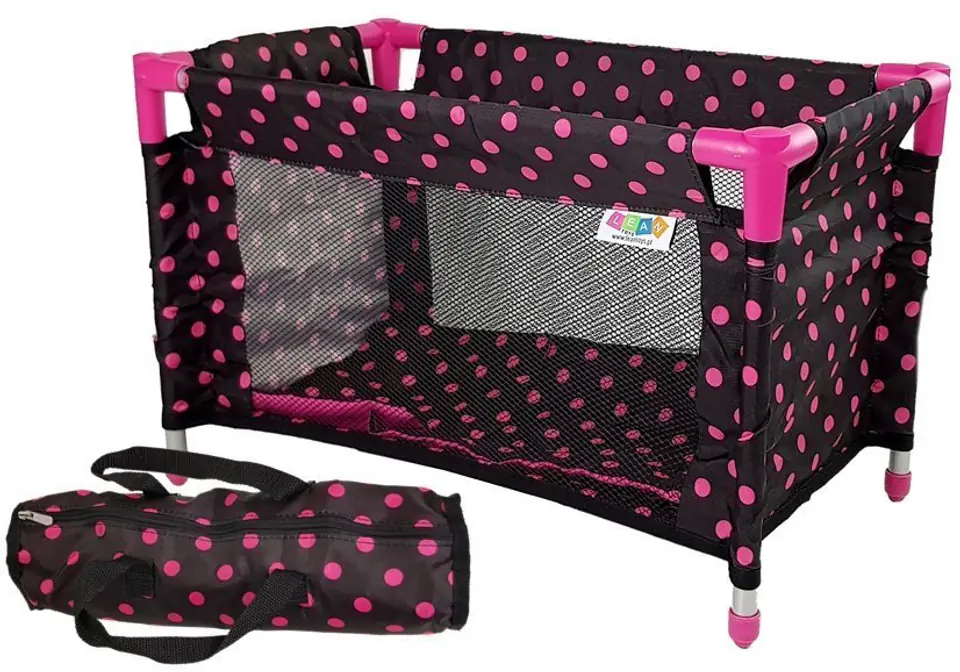 Teraz lalka Twojej pociechy ma własny kąt i miejsce, gdzie może spać jej lalka. Dzięki siateczkowym bokom łóżeczka może obserwować co dzieje się z lalką i bacznie czuwać. Stelaż wykonany jest z aluminiowym rurek z łączeniami z plastiku w kolorze różowym. Do zestawu dołączona jest kołderka oraz poduszeczka. Całość łóżeczka i elementów jest w kolorze czarnym z różowymi kropkami. Łatwo można go zdemontować i przechowywać w przenośnej torbie, dzięki czemu można wziąć je zawsze ze sobą. W środku zmieści się lalka o wielkości około 40 cm.