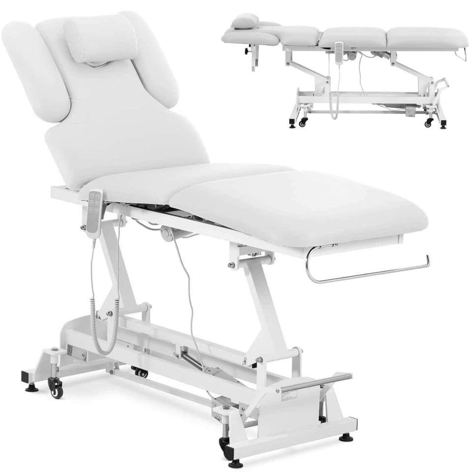 Kod producenta: 10040519Łóżko do masażu marki Physa sprawdzi się w gabinecie i studio masażu oraz w obiektach SPA Wellness. Przyda się fizjoterapeutom, masażystom czy kosmetyczkom. Łóżko posiada bardzo solidną konstrukcję. Zostało wyposażone w pilot zdalnego sterowania oraz uchwyt na rolkę papieru. Stół do masażu posiada trzy silniki o łącznej mocy 68 W. Regulują one wysokość mebla w zakresie 640-868 mm, a także kąt oparcia (55deg;). Zmienić można też kąt siedziska, dzięki czemu zawsze znajdziesz najlepsze ułożenie dla swoich klientów. Zagłówek posiada zdejmowaną poduszkę. Różne grubości piankowego wypełnienia (60-80 mm) zapewniają wygodę i gwarantuje komfort podczas trwania zabiegu. Skóra syntetyczna sprawia, że stół do masażu można szybko i łatwo wyczyścić, nie wchłania on płynów ani kurzu. Solidna konstrukcja wykonana została ze stali malowanej proszkowo. Nośność mebla wynosi 250 kg. 4 koła umożliwiają łatwe przesuwanie łóżka.Cechy produktu: