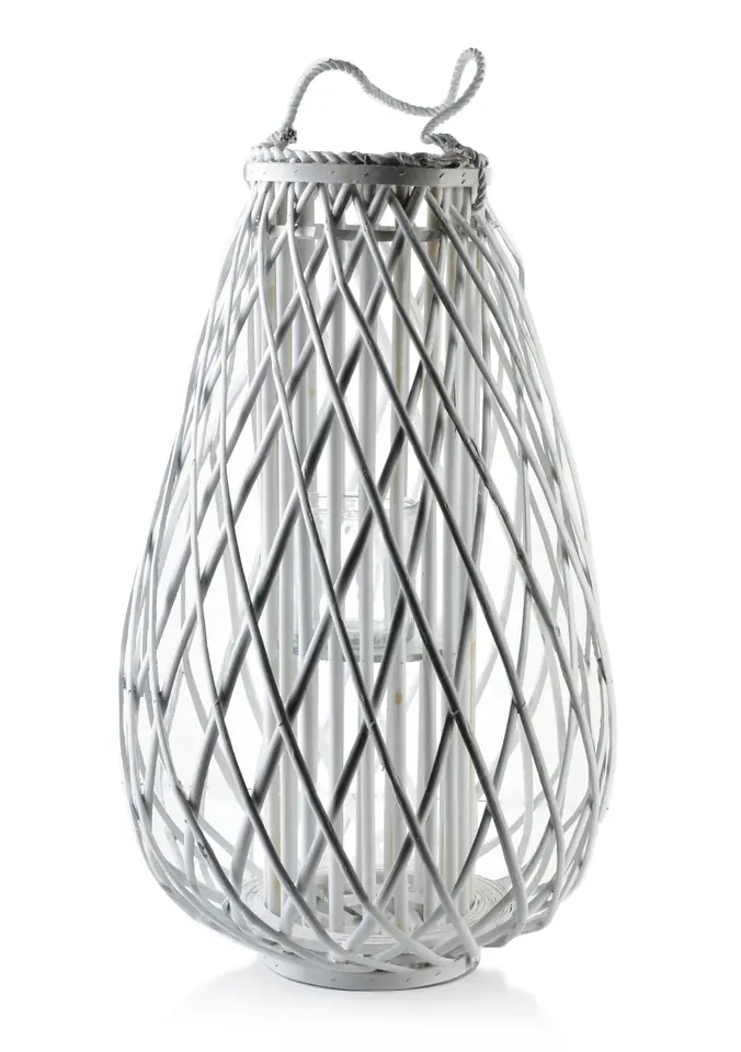 Nowoczesny lampion wiklinowy LUCIE marki Mondex. We wnętrzu ażurowej konstrukcji umiejscowiony został szklany lampion, do którego można włożyćświece. Uchwyt wykonany ze sznura pozwala na łatwe przenoszenie lampionu, ale także dodaje mu charakteru. Dekoracja idealnie nadaje się do ogrodu, a także do wystroju balkonu.wymiary: 20x42xh70cm waga: 2,262kg wkład szklany: 12xh12cm zapakowany jednostkowo w brązowy karton 44x44xh72cm