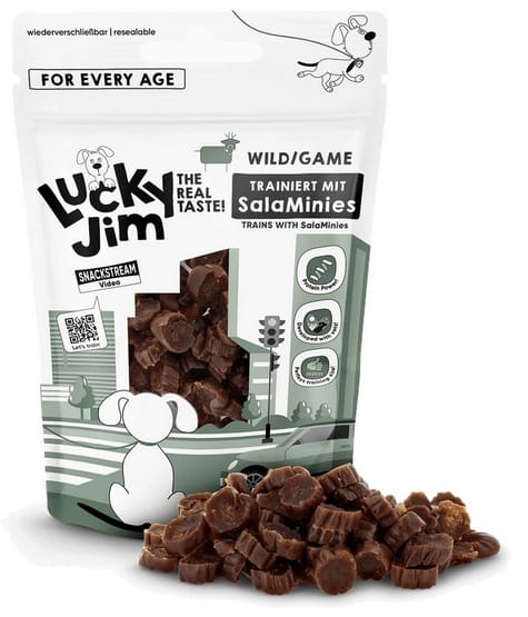 Hej, to ja – Lucky Jim! I powiem wam: kiedy mój człowiek wyciąga SalaMinies, wiem, o co chodzi.Przysmaki w kształcie salami, wystarczająco małe, aby trenować i jeść na co dzień – czysta radość!Czy to jako szybka nagroda, czy po prostu przekąska – jestem na tak!Naturalnie bez zbóż, bez dodatku cukru, nietestowane na zwierzętach i opracowane we współpracy z weterynarzami.A żeby nie wysychały: oczywiście w zamykanym opakowaniu.Skład:Mięso i produkty pochodzenia zwierzęcego 94% (dziczyzna 30%), produkty pochodzenia roślinnego.Składniki analityczne:białko surowe 29%, tłuszcz 20,4%, popiół surowy 5,5%, włókno surowe 1,5%, wilgotność 15%Zalecana dzienna ilość: