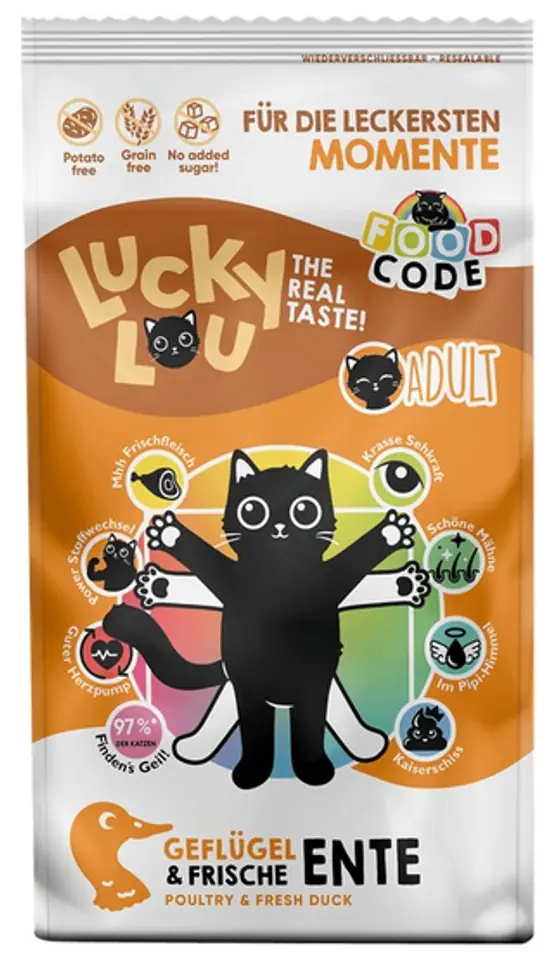 Lucky Lou Food Code Lifestage Adult Drób & KaczkaSzukasz Kodu do Szczęścia dla swojego kota, najlepszej suchej karmy? Czy jest fanem karmienia mieszanego? Sucha karma Lucky Lou Food Code to idealne rozwiązanie. Za tą nazwą kryje się starannie opracowany przepis na szczęście. Idealna równowaga smaku i witalności dla kotów.We wszystkich pysznych odmianach znajdziesz korzyści dla kotów w każdym wieku - wszystkie potrzebują innej proporcji składników odżywczych. Ale nie tylko dostosowujemy składniki, ale także dopasowujemy wielkość krokieta dla każdego kota - tak właśnie działa prawdziwy etap życia! Każdy kot znajdzie swoją ulubioną odmianę Lucky Lou Food Code.Nie znajdziesz tu zbóż, dodatku cukru i konserwantów. Nie korzystamy też z inżynierii genetycznej ani testów na zwierzętach. W naszej żywności premium łączymy świeże mięso i wysokiej jakości suszone białko. Dzięki zastosowaniu najnowocześniejszych technologii, najsurowszej kontroli jakości i najwyższej jakości składników, pełnowartościowe przepisy Lucky Lou Food Code stają się absolutnym hitem. Aż 97% kotów, próbujących testowe porcje, uznało to za fajne jedzenie. Nasz kod żywieniowy jest tworzony z kocim zmysłem!Skład:drób 63% (suszone mięso drobiowe 25%, świeże mięso z kaczki 22%, tłuszcz drobiowy, białko drobiowe), tapioka 22%, groszek, marchew, jajo suszone 1%, siemię lniane (świeżo mielone) 0,5%, drożdże piwne 0,5%, kocimiętka 0,5%, cykoria 0,1%Analiza:białko surowe 33%, zawartość tłuszczu 19%, popiół surowy 6,5%, włókno surowe 2,5%Dodatki:cynk (3b603) 80 mg, mangan (3b502) 8 mg, miedź (3b405) 6 mg, jod (3b202) 2 mg, witamina A (3a672a) 18000 IU, witamina D3 (3a671) 1300 IUDawkowanie (żywienie mieszane):